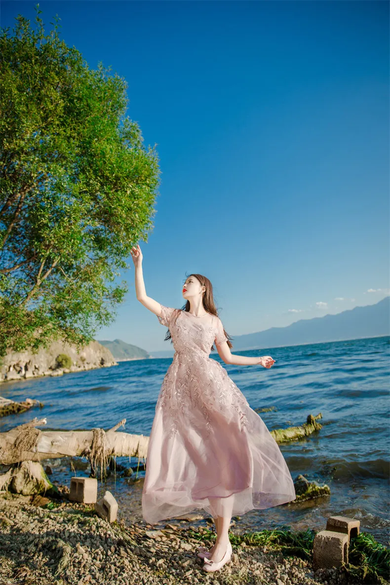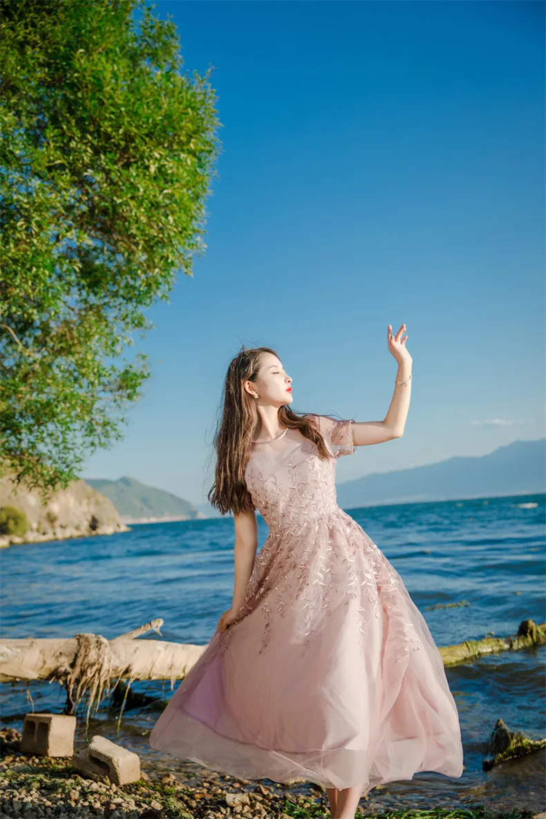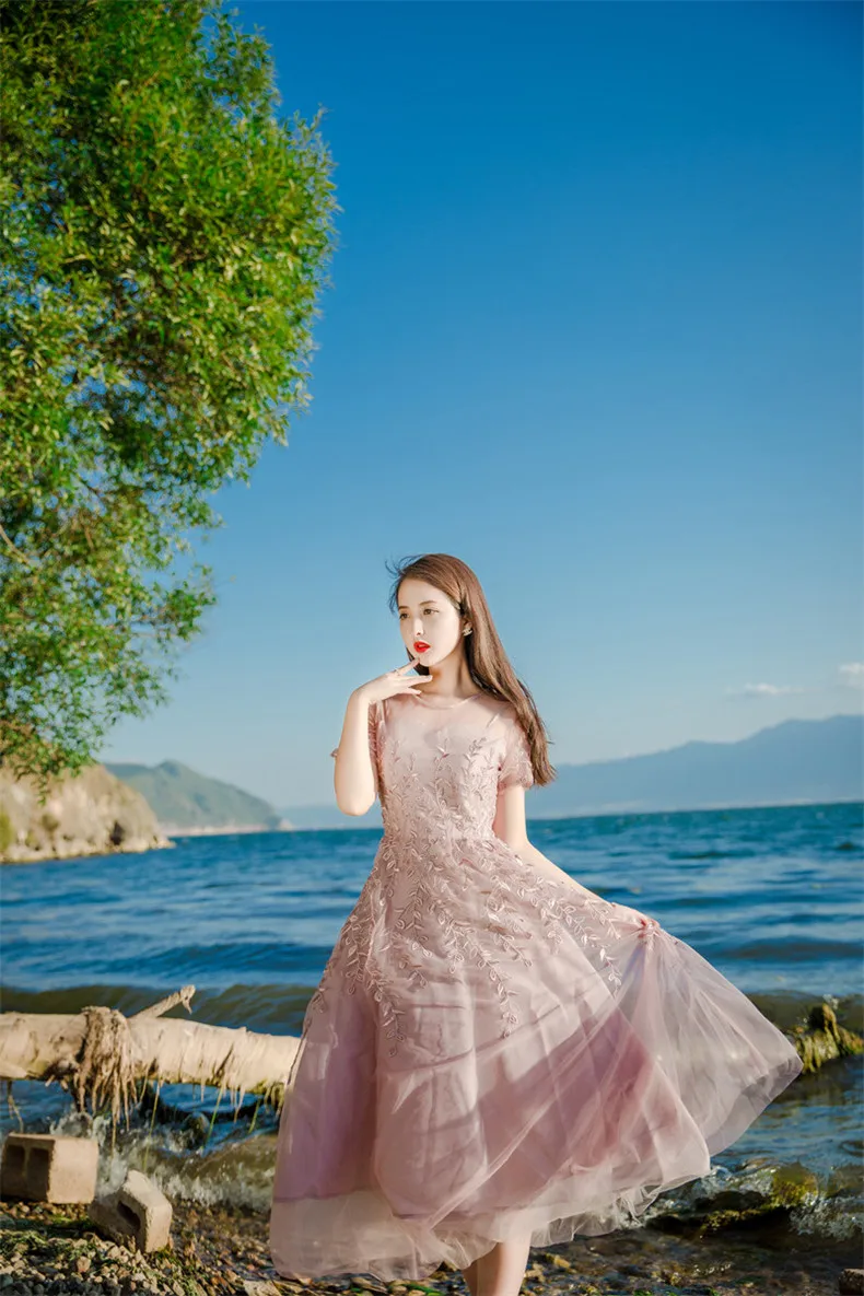 שמלת פעמון רקמה ורשת אביבית שרוול קצר לאנון – איכותית ברמה גבוהה