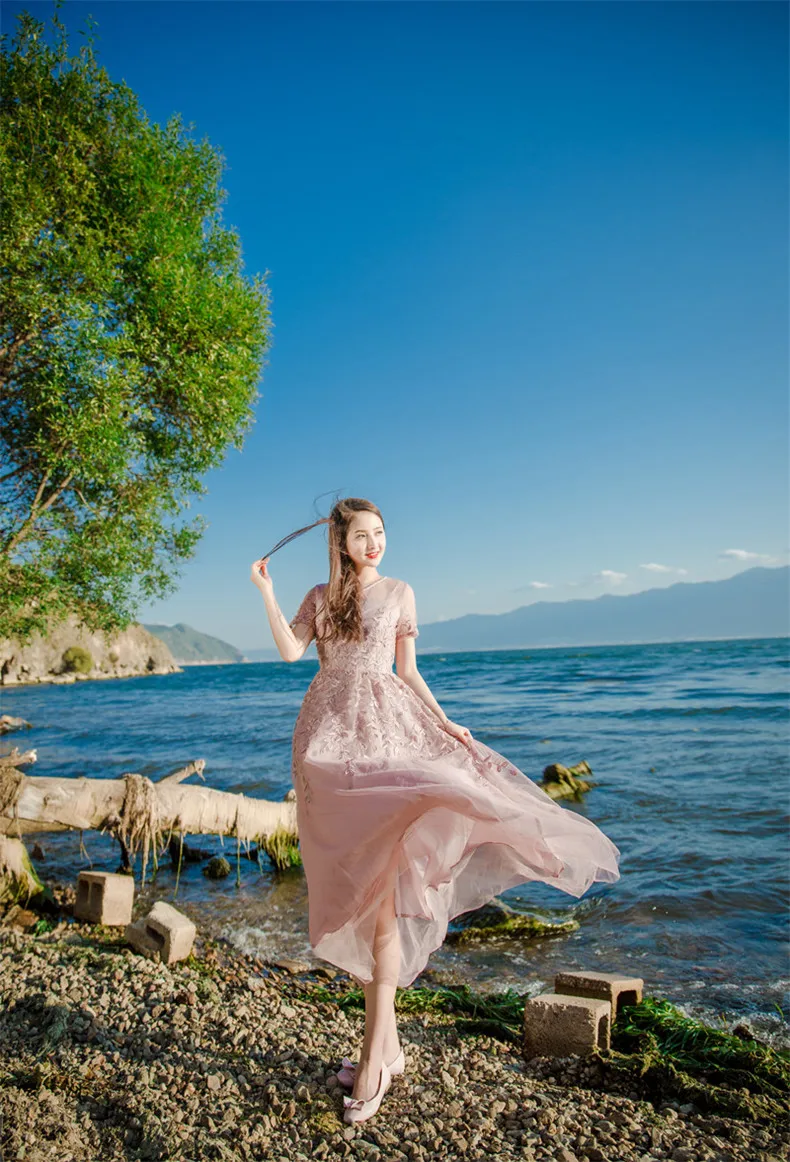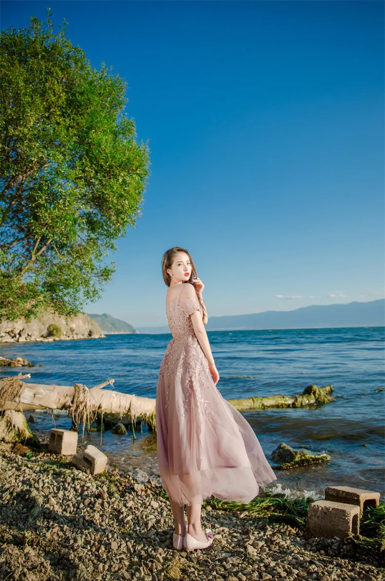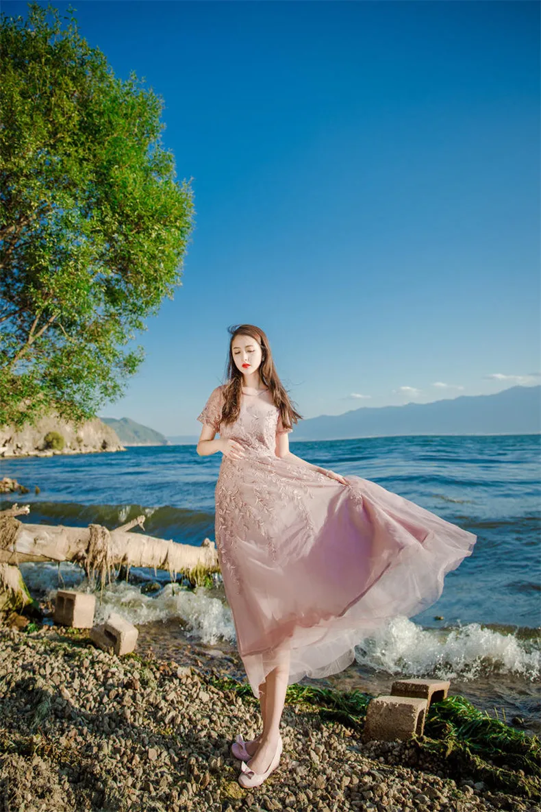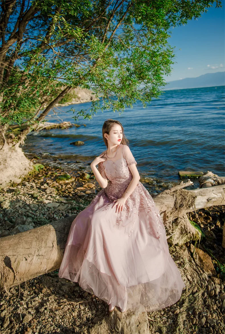 שמלת פעמון רקמה ורשת אביבית שרוול קצר לאנון – איכותית ברמה גבוהה