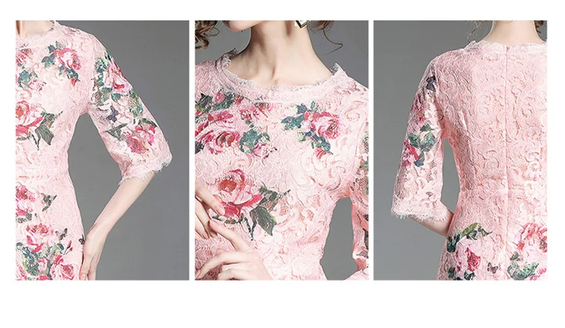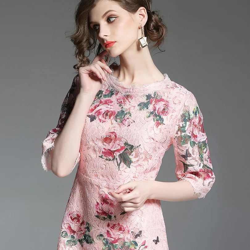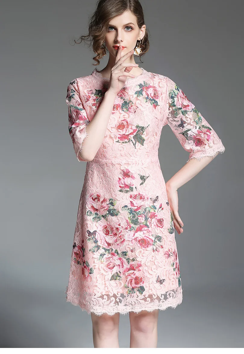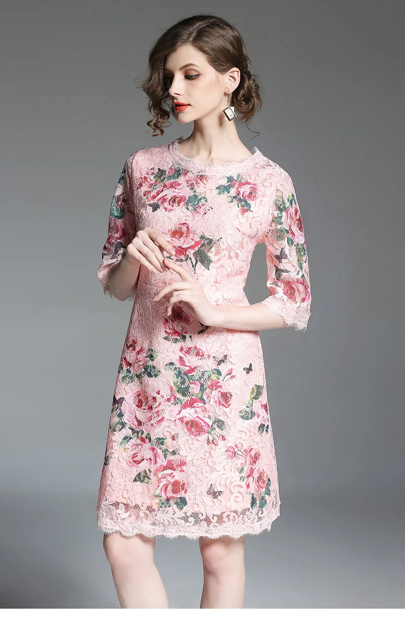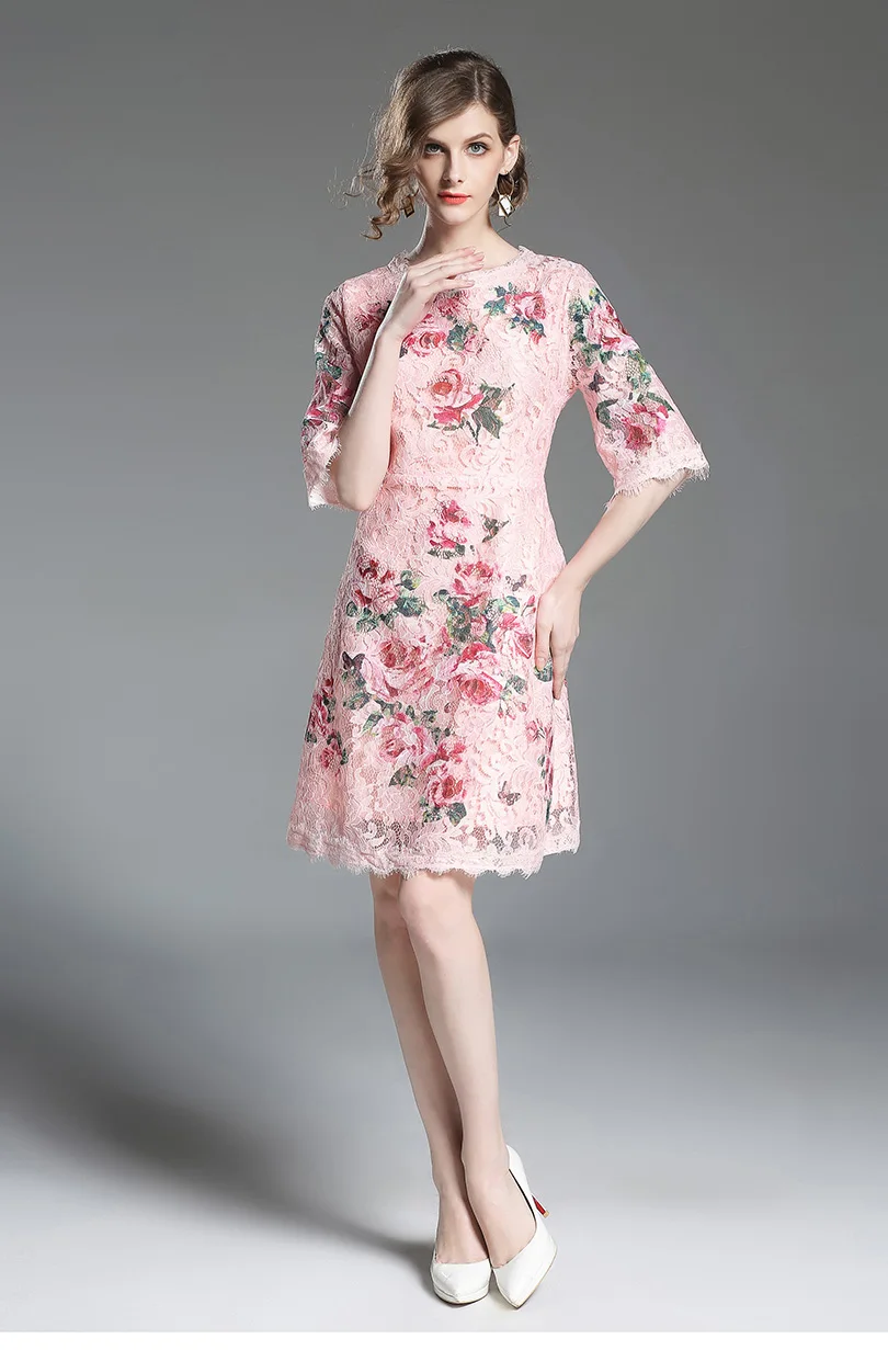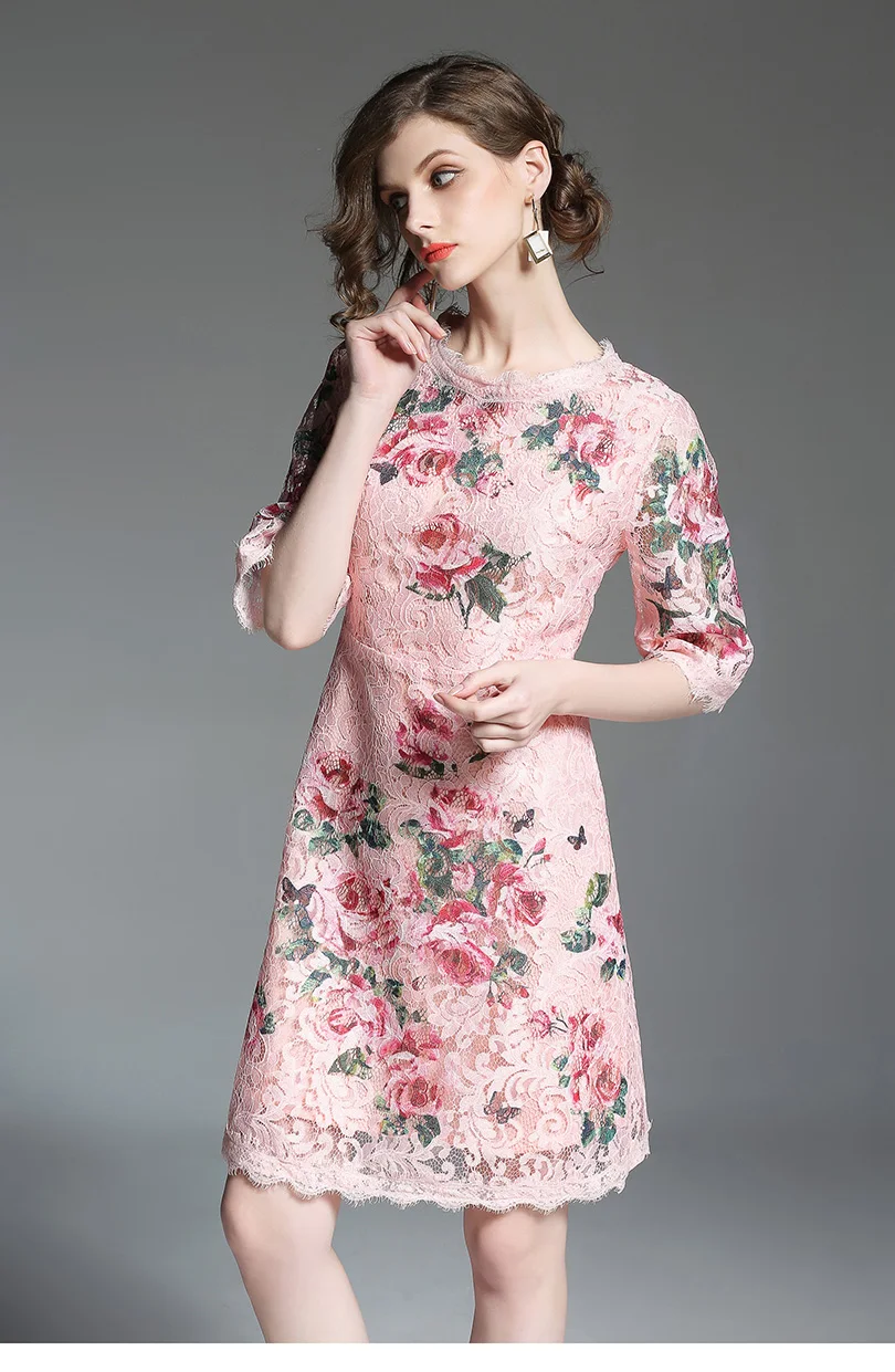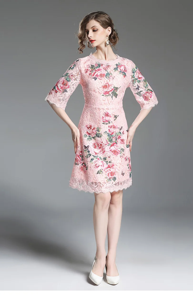 שמלת קיץ קצרה תחרה עם הדפס לנשים גובה ברך אלגמטית חצי שרווול ורודה מקסימה
