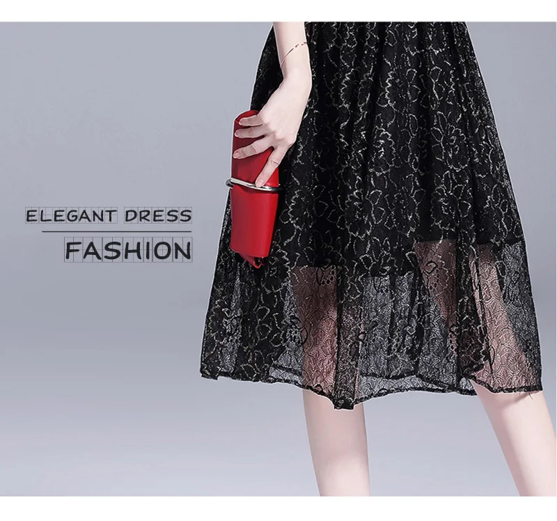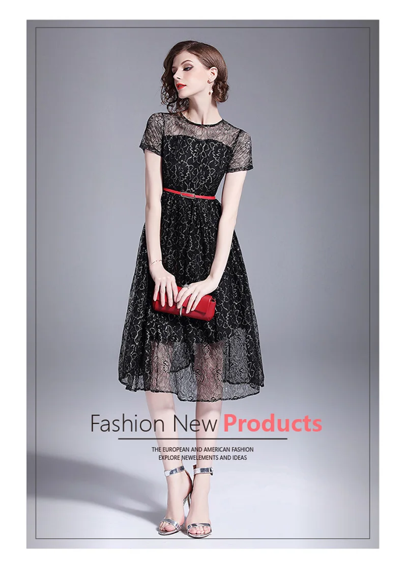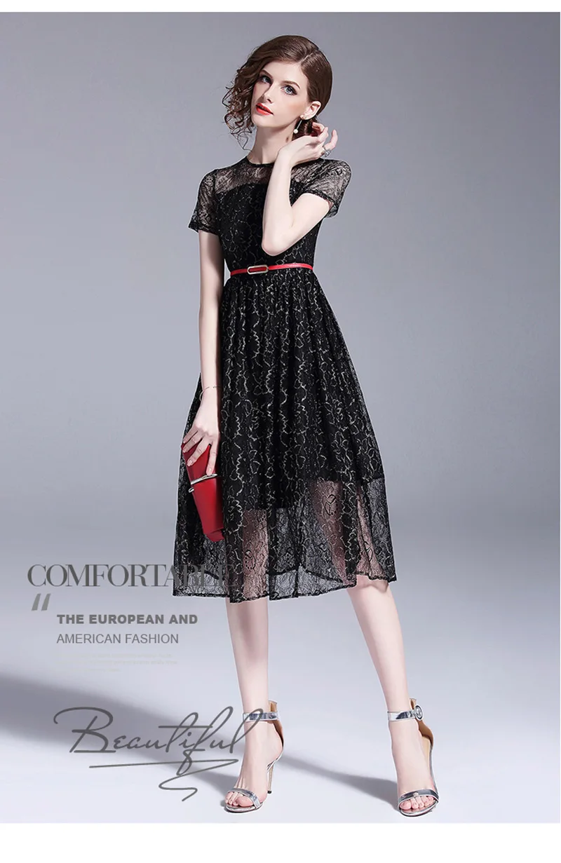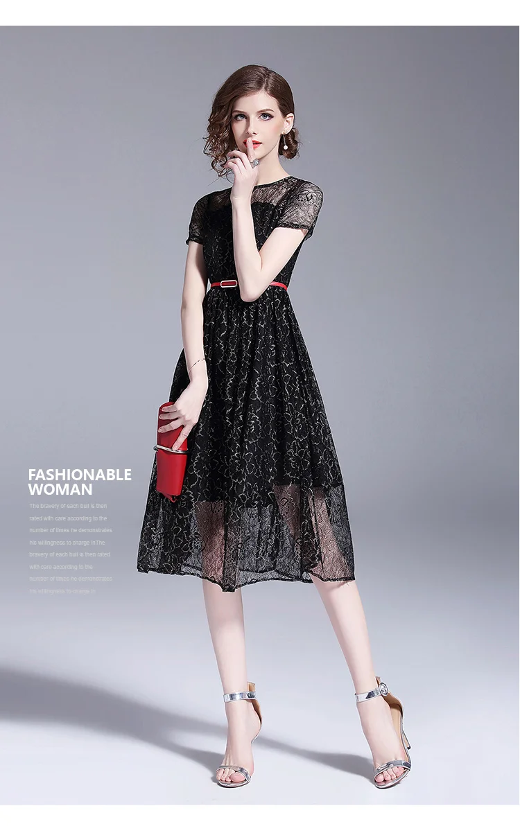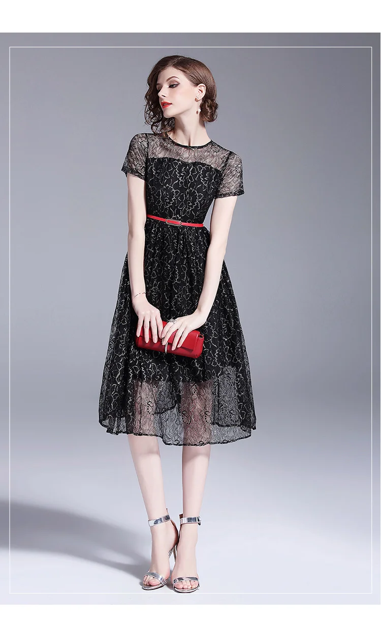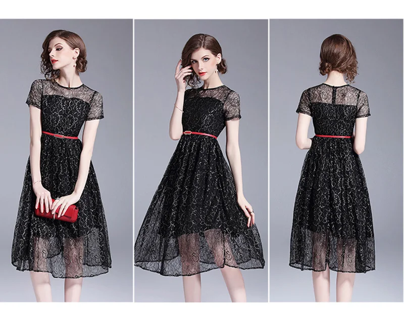 שמלת תחרה שחורה לנשים עם שרוול קצר מהממת אלגנטית ומרשימה גובה ברך